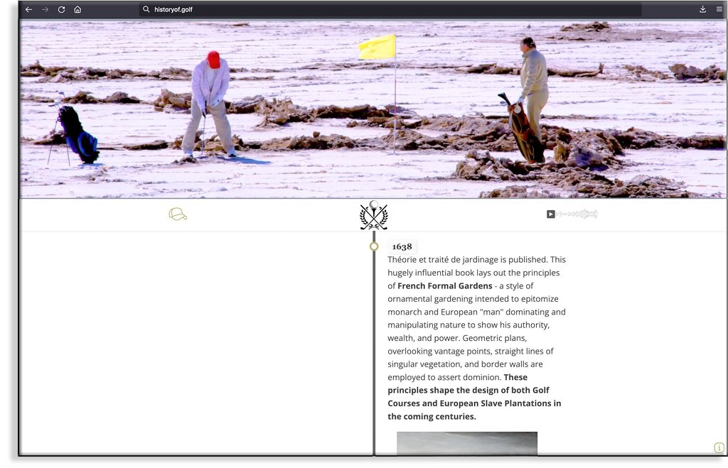 HistoryOf.Golf is a web project containing video, sound and text. (...) A video embed contains the film How The West Was Won (2018). An audio button triggers a sound recording of the two men simply exchange dad jokes to one another. Scroll down to view an epic timeline that contextualizes climate change, westward expansion, colonialism, politics, and even the creation of the artwork through the chronology of golf.